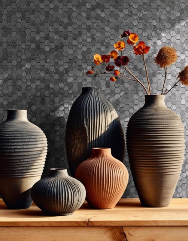 Reflektujući heksagoni i plisirane teksture – Dinamična igra svetlosti i strukture. Heksagonski motivi menjaju izgled u zavisnosti od osvetljenja, dok plisirani reljef unosi dubinu i pokret.