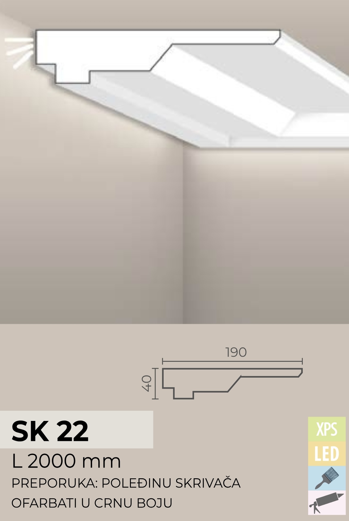 Postavljanjem SKRIVAČA RASVETE promenićete atmosferu celokupnog prostora. Ove lajsne se mogu koristiti kao skrivači svetla i/ili kao ugaone lajsne. Oplemenjuju svaki enterijer, inovativni su i vrlo izdržljivi. Dodaju notu elegancije, praktičnosti i estetskog zadovoljstva prostoriji.